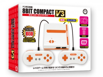 本製品「8ビットコンパクトV3」は、懐かしの名機「ファミコン」のソフトが楽しめるFC用互換機となります。 本体・コントローラ2個、AV端子ケーブル、ACアダプタがセットになったオールインパックで、ソフトがあればすぐに楽しむことができます。ご好評頂いておりましたコンパクトな本体サイズや、7ピンコントローラ端子搭載、連射機能搭載等の性能はそのままに、本体や付属のコントローラのカラーは「ホワイト×レッド」になった新機種「V3」です。88タイトルのオリジナル8BITゲームも内蔵しています。