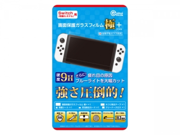 本製品「Switch有機ELモデル用 画面保護ガラスフィルム極+(プラス)」は、疲れ目の原因となる「ブルーライト」を約45%カットする機能を持った、画面保護ガラスフィルムです。また、「硬度9H」の高硬度ガラスを採用しておりますので、通常のフィルムによりも圧倒的にキズに強く、「高透明度」・「飛散防止」・「スムースタッチ」・「防指紋」・「ラウンドエッジ加工」等、ゲームをプレイする上で有用な機能も併せ持った、高品質で機能的な「液晶画面保護ガラスフィルム」製品となっております。