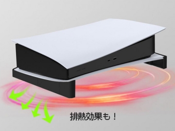本製品、「(PS5用)横置き専用スタンド」は、PS5本体に取り付けることで横置きでの設置時に抜群の安定感を発揮する、横置き用スタンドになります。PS5本体にピッタリとフィットする専用サイズで、見た目もスマートにPS5本体を横置きで使用することができます。また、取り付け後はPS5本体の接地面が少なくなりますので、排熱の効果も得られます。本体への取り付けも簡単で、PS5通常版、PS5デジタル・エディション、どちらの本体でもご使用いただける製品です。
